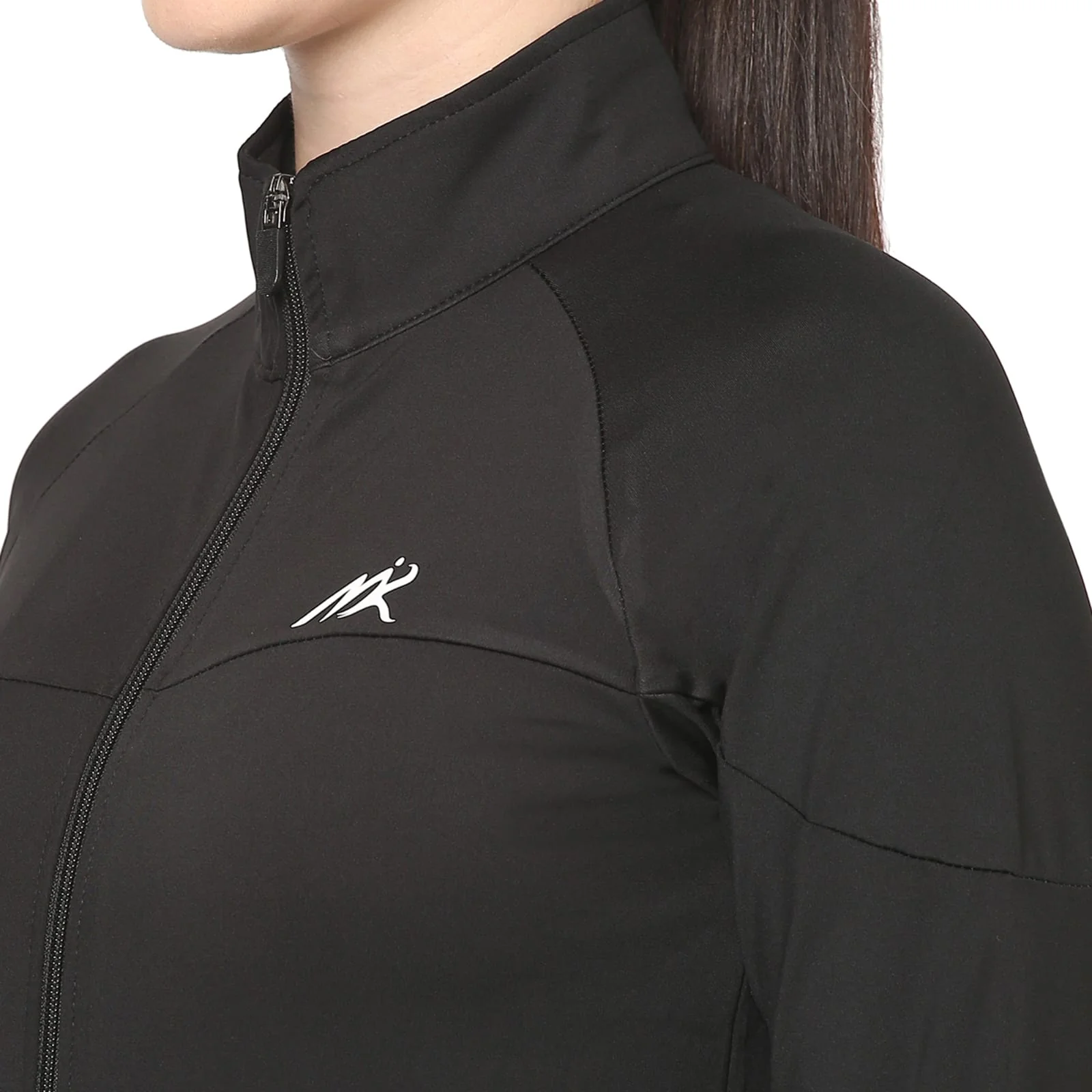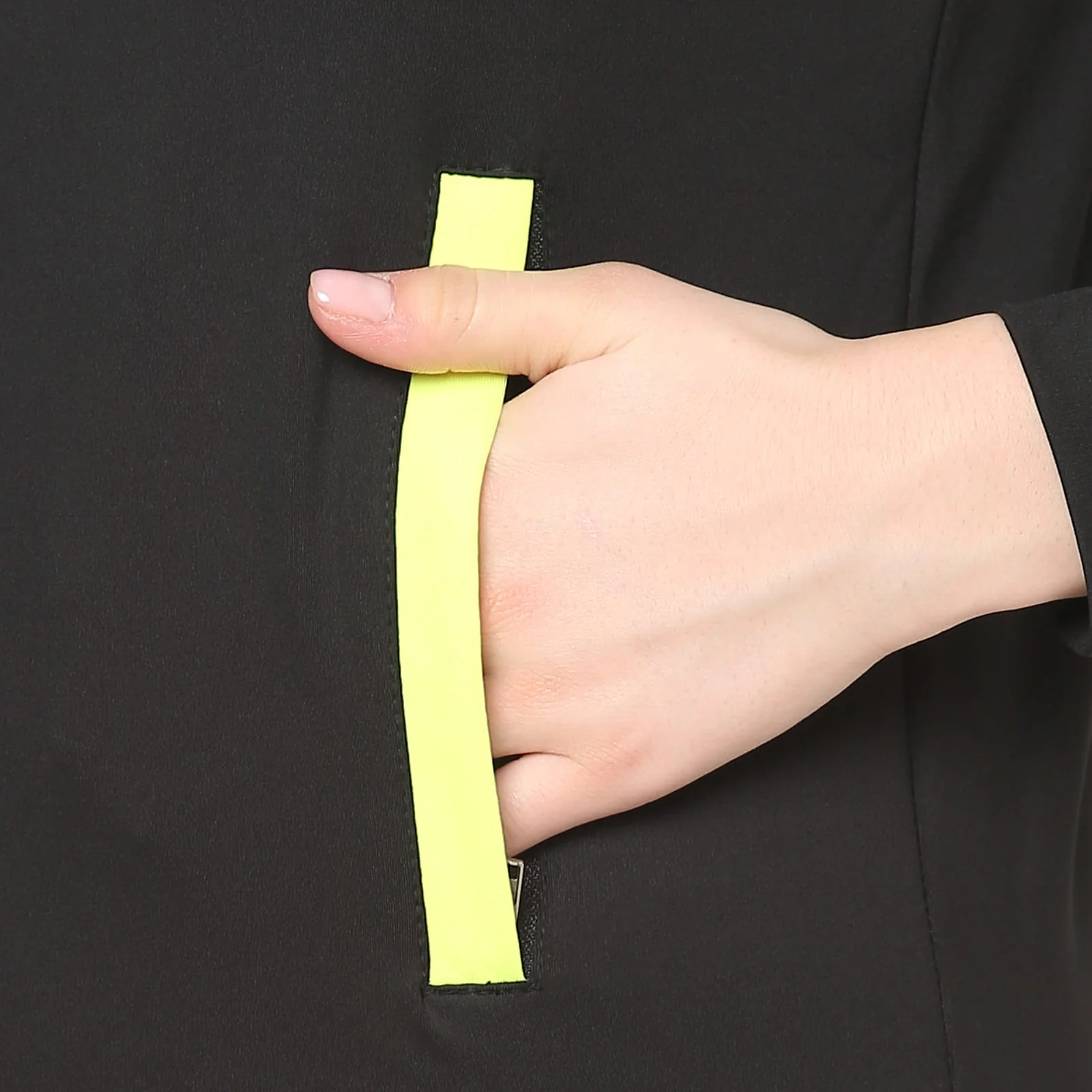Black solid lightweight sporty jacket with zip detail, has a mock collar, 2 pockets ,has a zip closure, long sleeves.