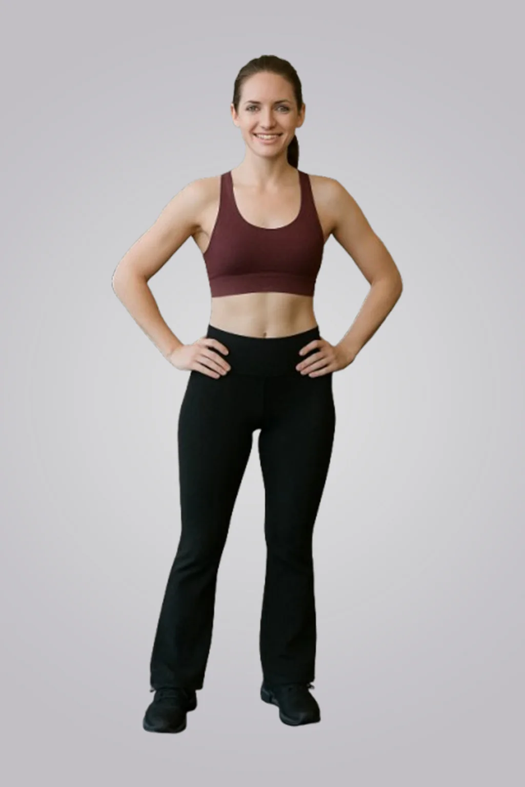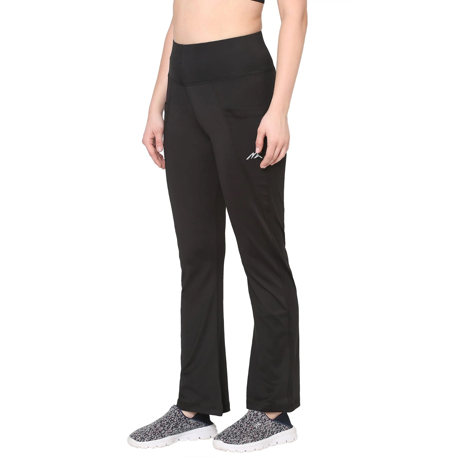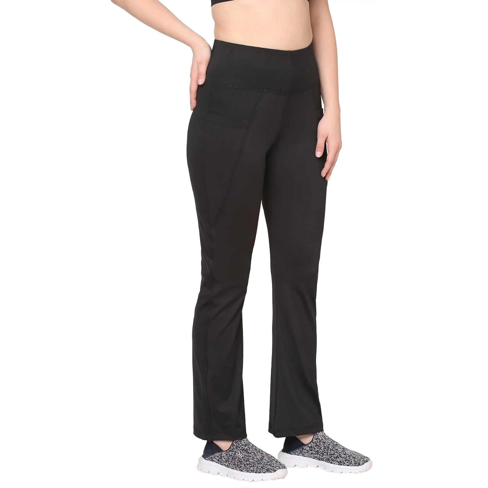 Black Gym and Yoga Flare Pant have an elasticized waistband, slip-on closure, 2 pockets, and rapid-dry technology