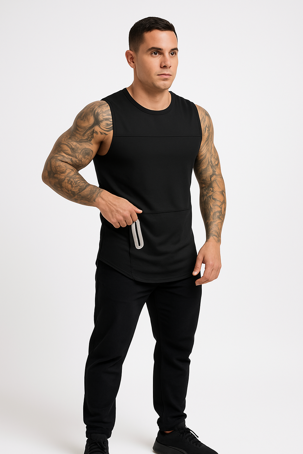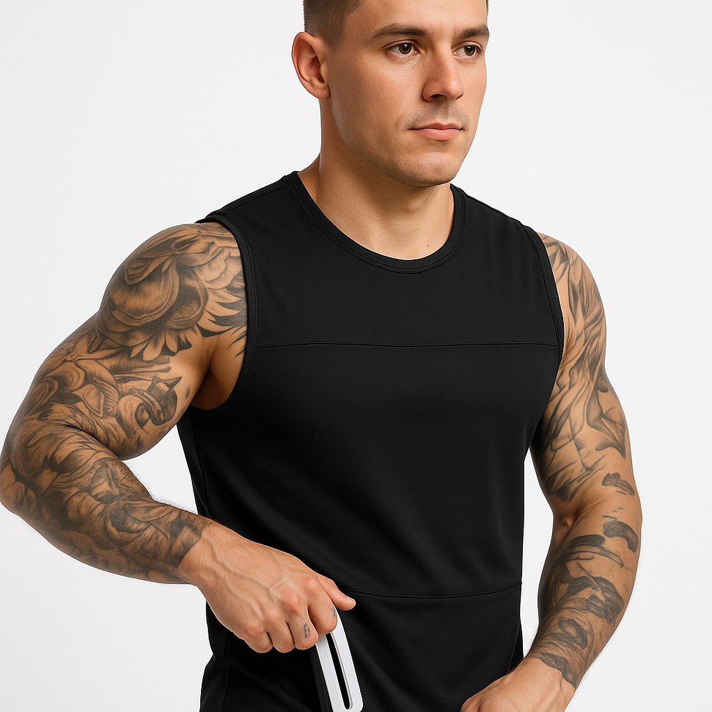 Round Hem Side Pocket Sleeveless t-shirt. Upgrade your workout game with Black Men's Gym Stringers that offer breathability and unrestricted movement. Perfect for intense training, these stringers enhance muscle definition and keep you cool. Ideal for gym-goers who prioritize comfort, performance, and bold athletic style.